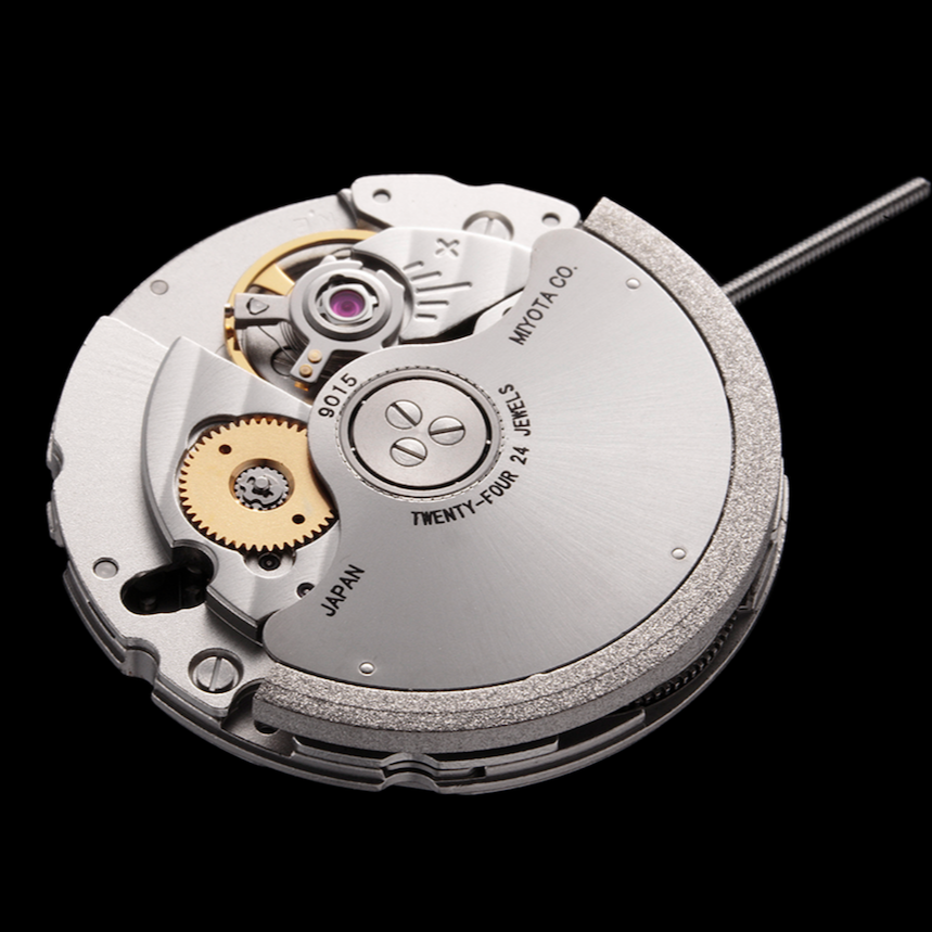Movimento orologio automatico calibro Miyota 9015 SLIM con 24 rubini, altezza soli 3,9 mm. 28.800 alternanze/ora, riserva di carica di 42 ore.
